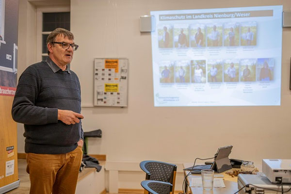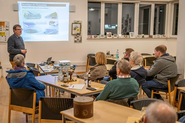 Zur Veranstaltung der VHS Nienburg zusammen mit der Klimaschutzagentur Mittelweser hatten sich 17 Personen angemeldet. Die umfangreiche Präsentation von Herrn H. Herdejürgen befasste sich mit vielen Aspekten der Photovoltaik. Z.B. Welche Anlagenbestandteile gibt es (es wurden Muster von Befestigungen und Modulen gezeigt), welche Voraussetzungen für die Installation müssen erfüllt werden, welche Kombinationen sind umsetzbar (Batteriespeicher, Elektroauto, Heizsysteme) etc. Gern beantwortete der Referent die Zuschauerfragen und animierte die Teilnehmer, gern die Dienste der Klimaschutzagentur, die dem Landkreis Nienburg angegliedert ist, in Gebrauch zu nehmen. Weitere Informationen über Klimaschutzagentur Mittelweser e.V.